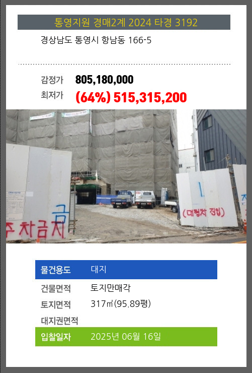 사건번호 2024 타경 3192 본건은 경상남도 통영시 항남동 166-5소재하는 대지경매 물건의 포스팅입니다. 건물면적 [ 토지만매각 ]토지면적 [ 317㎡ (95.89평) ] 시세를 반영한 감정가 805,180,000에서2회 유찰되어