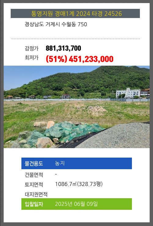사건번호 2024 타경 24526 본건은 경상남도 거제시 수월동 750소재하는 농지경매 물건의 포스팅입니다. 토지면적 [ 1086.7㎡ (328.73평) ] 시세를 반영한 감정가 881,313,700에서3회 유찰되어 감정가 대비 51%최저가