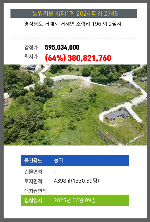 사건번호 2024 타경 2748 본건은 경상남도 거제시 거제면 소랑리 196 외 2필지소재하는 농지경매 물건의 포스팅입니다. 토지면적 [ 4398㎡ (1330.39평) ] 시세를 반영한 감정가 595,034,000에서2회 유찰되어