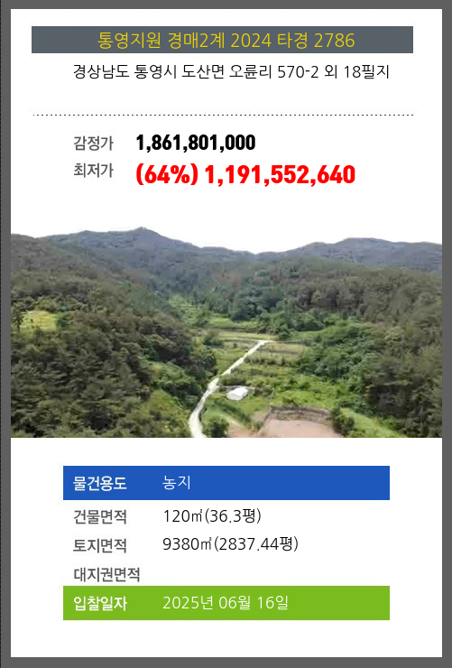 사건번호 2024 타경 2786 본건은 경상남도 통영시 도산면 오륜리 570-2 외 18필지소재하는 농지경매 물건의 포스팅입니다. 건물면적 [ 120㎡ (36.3평) ]토지면적 [ 9380㎡ (2837.44평) ] 시세를