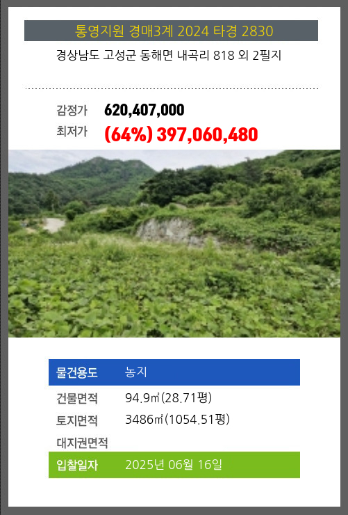 사건번호 2024 타경 2830 본건은 경상남도 고성군 동해면 내곡리 818 외 2필지소재하는 농지경매 물건의 포스팅입니다. 건물면적 [ 94.9㎡ (28.71평) ]토지면적 [ 3486㎡ (1054.51평) ] 시세를