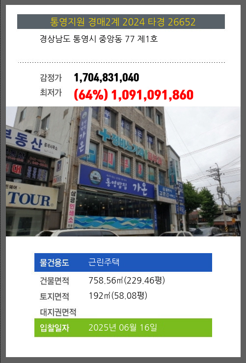사건번호 2024 타경 26652 본건은 경상남도 통영시 중앙동 77 제1호소재하는 근린주택경매 물건의 포스팅입니다. 건물면적 [ 758.56㎡ (229.46평) ]토지면적 [ 192㎡ (58.08평) ] 시세를 반영한 감정가