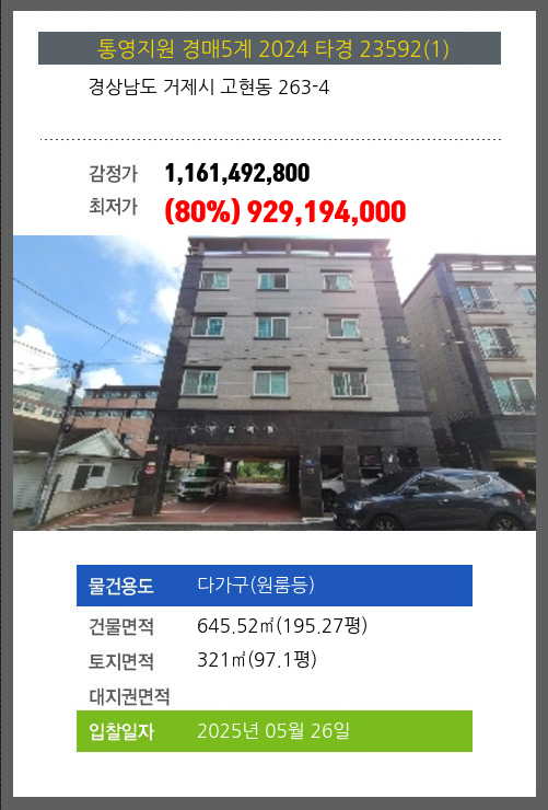사건번호 2024 타경 23592(1) 본건은 경상남도 거제시 고현동 263-4소재하는 다가구(원룸등)경매 물건의 포스팅입니다. 건물면적 [ 645.52㎡ (195.27평) ]토지면적 [ 321㎡ (97.1평) ] 시세를 반영한 감정가 1,161,492,800에서1회