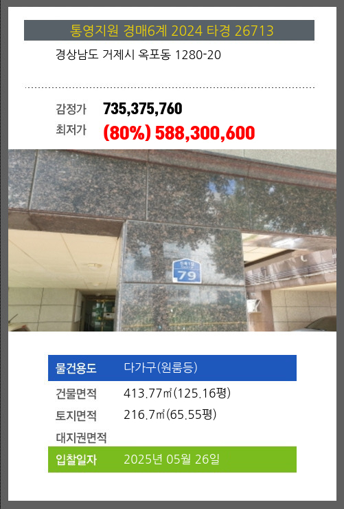 사건번호 2024 타경 26713 본건은 경상남도 거제시 옥포동 1280-20소재하는 다가구(원룸등)경매 물건의 포스팅입니다. 건물면적 [ 413.77㎡ (125.16평) ]토지면적 [ 216.7㎡ (65.55평) ] 시세를 반영한 감정가 735,375,760에서1회