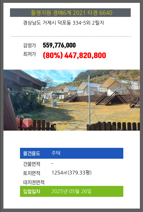 사건번호 2021 타경 6640 본건은 경상남도 거제시 덕포동 334-5외 2필지소재하는 주택경매 물건의 포스팅입니다. 토지면적 [ 1254㎡ (379.33평) ] 시세를 반영한 감정가 559,776,000에서1회 유찰되어 감정가 대비