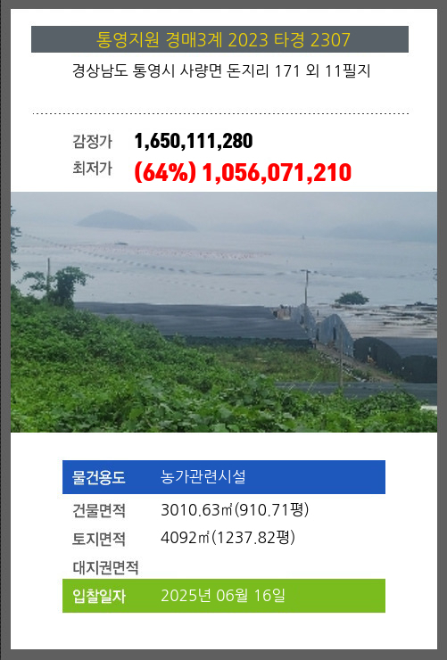 사건번호 2023 타경 2307 본건은 경상남도 통영시 사량면 돈지리 171 외 11필지소재하는 농가관련시설경매 물건의 포스팅입니다. 건물면적 [ 3010.63㎡ (910.71평) ]토지면적 [ 4092㎡ (1237.82평) ] 시세를