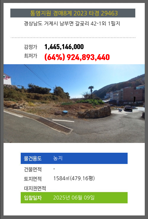 사건번호 2023 타경 29463 본건은 경상남도 거제시 남부면 갈곶리 42-1외 1필지소재하는 농지경매 물건의 포스팅입니다. 토지면적 [ 1584㎡ (479.16평) ] 시세를 반영한 감정가 1,445,146,000에서2회 유찰되어 감정가