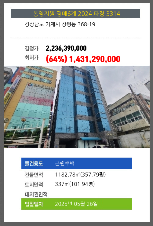 사건번호 2024 타경 3314 본건은 경상남도 거제시 장평동 368-19소재하는 근린주택경매 물건의 포스팅입니다. 건물면적 [ 1182.78㎡ (357.79평) ]토지면적 [ 337㎡ (101.94평) ] 시세를 반영한 감정가 2,236,390,000에서2회