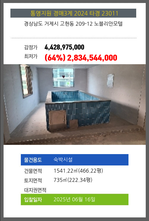 사건번호 2024 타경 23011 본건은 경상남도 거제시 고현동 209-12 노블리안모텔소재하는 숙박시설경매 물건의 포스팅입니다. 건물면적 [ 1541.22㎡ (466.22평) ]토지면적 [ 735㎡ (222.34평) ] 시세를 반영한 감정가