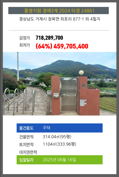 사건번호 2024 타경 24861 본건은 경상남도 거제시 장목면 외포리 877-1 외 4필지소재하는 주택경매 물건의 포스팅입니다. 건물면적 [ 314.04㎡ (95평) ]토지면적 [ 1104㎡ (333.96평) ] 시세를