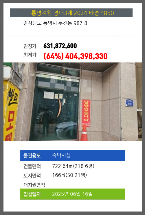 사건번호 2024 타경 4850 본건은 경상남도 통영시 무전동 987-8소재하는 숙박시설경매 물건의 포스팅입니다. 건물면적 [ 722.64㎡ (218.6평) ]토지면적 [ 166㎡ (50.21평) ] 시세를 반영한 감정가 631,872,400에서2회