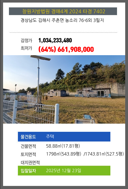 사건번호 2024 타경 7402 본건은 경상남도 김해시 주촌면 농소리 76-6외 3필지소재하는 주택경매 물건의 포스팅입니다. 건물면적 [ 58.88㎡ (17.81평) ]토지면적 [ 전체:1798㎡ (543.89평) 매각지분:1743.81㎡ (527.5평) ]