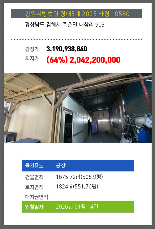 사건번호 2025 타경 10580 본건은 경상남도 김해시 주촌면 내삼리 903소재하는 공장경매 물건의 포스팅입니다. 건물면적 [ 1675.72㎡ (506.9평) ]토지면적 [ 1824㎡ (551.76평) ] 시세를 반영한 감정가