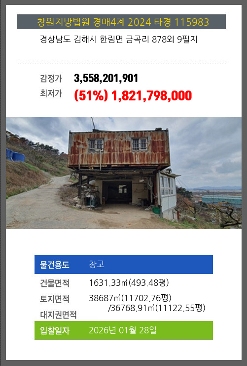 사건번호 2024 타경 115983 본건은 경상남도 김해시 한림면 금곡리 878외 9필지소재하는 창고경매 물건의 포스팅입니다. 건물면적 [ 1631.33㎡ (493.48평) ]토지면적 [ 전체:38687㎡ (11702.76평) 매각지분:36768.91㎡ (11122.55평) ]