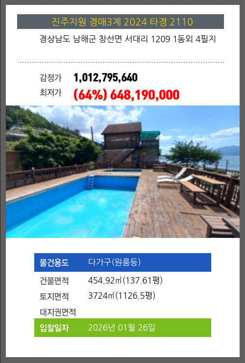 사건번호 2024 타경 5488 본건은 경상남도 거제시 하청면 석포리 42외 3필지소재하는 다가구(원룸등)경매 물건의 포스팅입니다. 건물면적 [ 1302.59㎡ (394.03평) ]토지면적 [ 1447㎡ (437.72평) ] 시세를 반영한