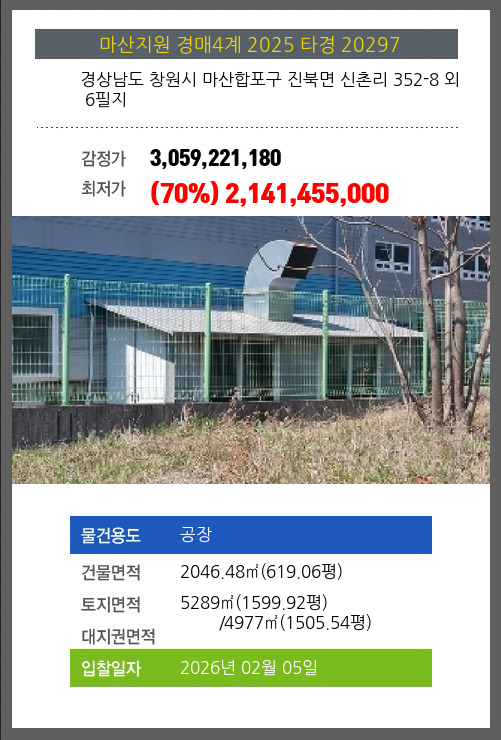 사건번호 2025 타경 20297 본건은 경상남도 창원시 마산합포구 진북면 신촌리 352-8 외 6필지소재하는 공장경매 물건의 포스팅입니다. 건물면적 [ 2046.48㎡ (619.06평) ]토지면적 [ 전체:5289㎡ (1599.92평) 매각지분:4977㎡
