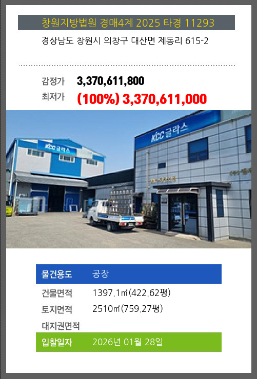 사건번호 2025 타경 11293 본건은 경상남도 창원시 의창구 대산면 제동리 615-2소재하는 공장경매 물건의 포스팅입니다. 건물면적 [ 1397.1㎡ (422.62평) ]토지면적 [ 2510㎡ (759.27평) ] 시세를 반영한