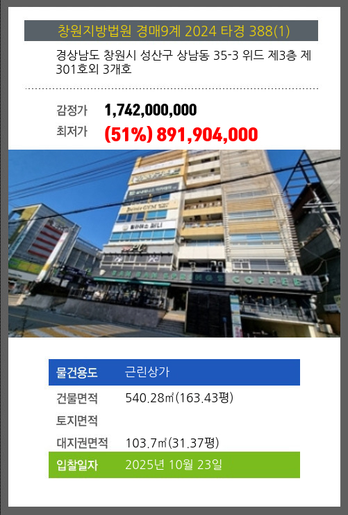 사건번호 2024 타경 388(1) 본건은 경상남도 창원시 성산구 상남동 35-3 위드 제3층 제301호외 3개호소재하는 근린상가경매 물건의 포스팅입니다. 건물면적 [ 540.28㎡ (163.43평) ]대지권 [ 103.7㎡ (31.37평)