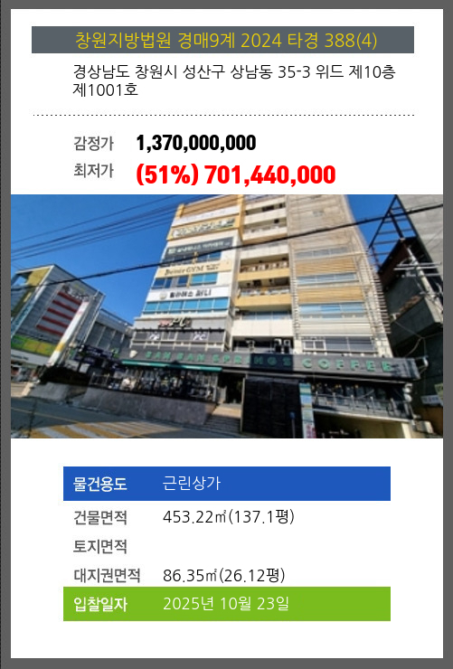 사건번호 2024 타경 388(4) 본건은 경상남도 창원시 성산구 상남동 35-3 위드 제10층 제1001호소재하는 근린상가경매 물건의 포스팅입니다. 건물면적 [ 453.22㎡ (137.1평) ]대지권 [ 86.35㎡ (26.12평) ]