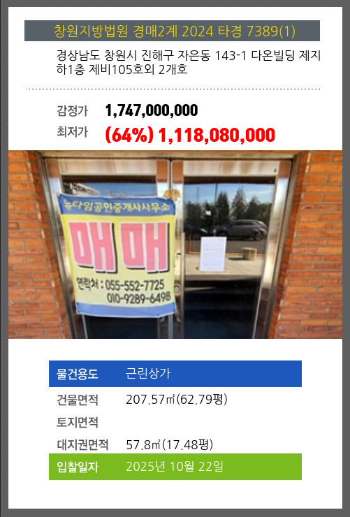 사건번호 2024 타경 7389(1) 본건은 경상남도 창원시 진해구 자은동 143-1 다온빌딩 제지하1층 제비105호외 2개호소재하는 근린상가경매 물건의 포스팅입니다. 건물면적 [ 207.57㎡ (62.79평) ]대지권 [ 57.8㎡ (17.48평)