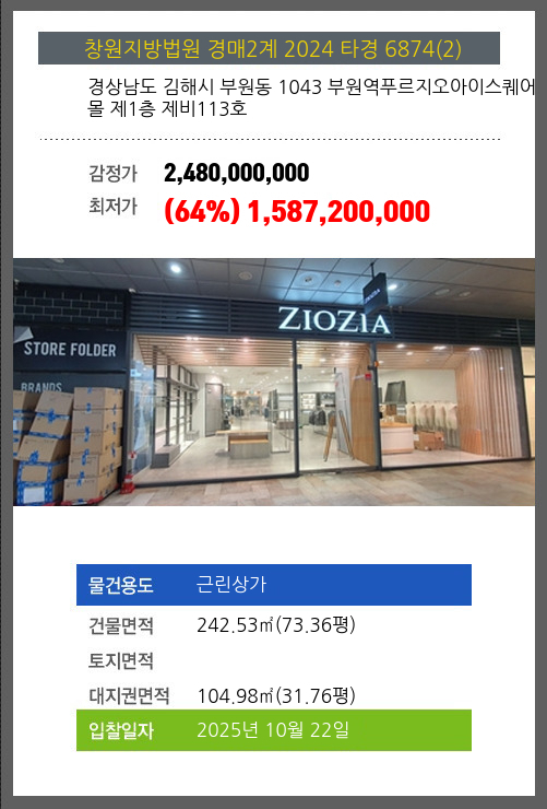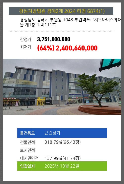 사건번호 2024 타경 6874(2) 본건은 경상남도 김해시 부원동 1043 부원역푸르지오아이스퀘어몰 제1층 제비113호소재하는 근린상가경매 물건의 포스팅입니다. 건물면적 [ 242.53㎡ (73.36평) ]대지권 [ 104.98㎡ (31.76평) ] 시세를