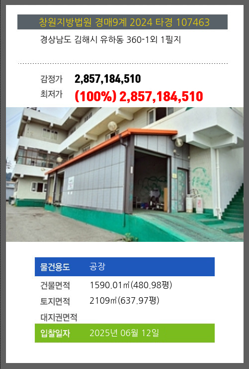 사건번호 2024 타경 107463 본건은 경상남도 김해시 유하동 360-1외 1필지소재하는 공장경매 물건의 포스팅입니다. 건물면적 [ 1590.01㎡ (480.98평) ]토지면적 [ 2109㎡ (637.97평) ] 시세를 반영한 감정가