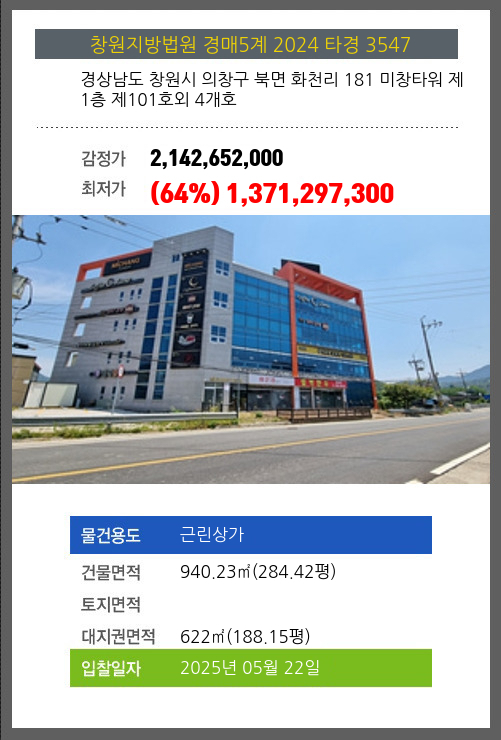 사건번호 2024 타경 3547 본건은 경상남도 창원시 의창구 북면 화천리 181 미창타워 제1층 제101호외 4개호소재하는 근린상가경매 물건의 포스팅입니다. 건물면적 [ 940.23㎡ (284.42평) ]대지권 [ 622㎡