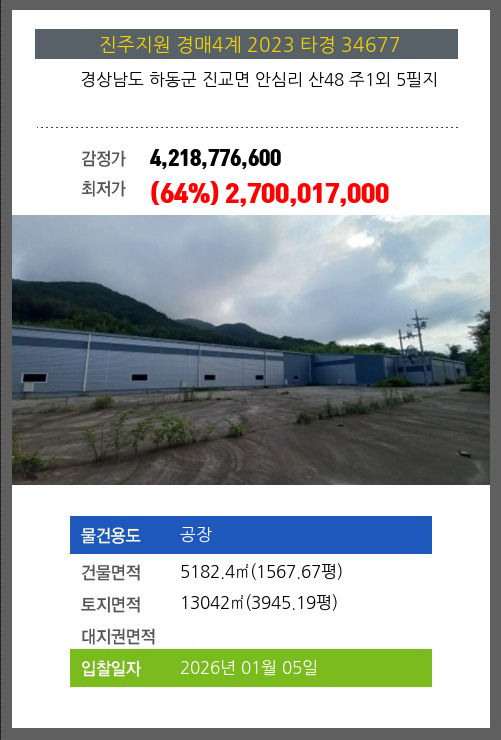 사건번호 2023 타경 34677 본건은 경상남도 하동군 진교면 안심리 산48 주1외 5필지소재하는 공장경매 물건의 포스팅입니다. 건물면적 [ 5182.4㎡ (1567.67평) ]토지면적 [ 13042㎡ (3945.19평) ] 시세를