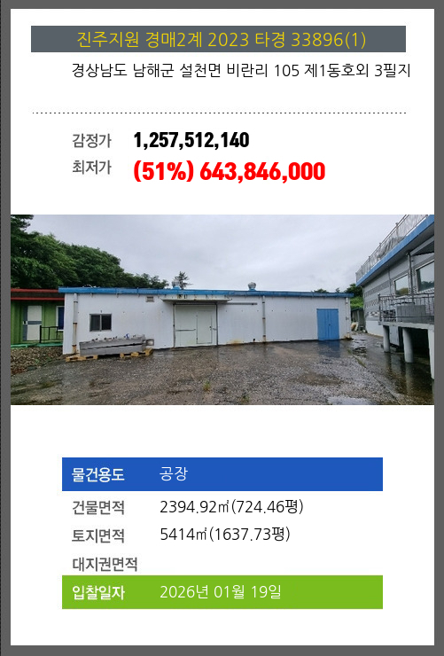 사건번호 2023 타경 33896(1) 본건은 경상남도 남해군 설천면 비란리 105 제1동호외 3필지소재하는 공장경매 물건의 포스팅입니다. 건물면적 [ 2394.92㎡ (724.46평) ]토지면적 [ 5414㎡ (1637.73평) ] 시세를