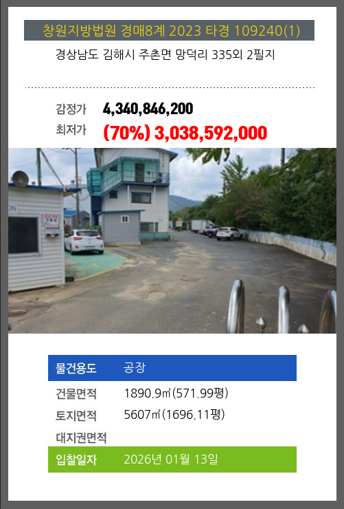 사건번호 2023 타경 109240(1) 본건은 경상남도 김해시 주촌면 망덕리 335외 2필지소재하는 공장경매 물건의 포스팅입니다. 건물면적 [ 1890.9㎡ (571.99평) ]토지면적 [ 5607㎡ (1696.11평) ] 시세를 반영한