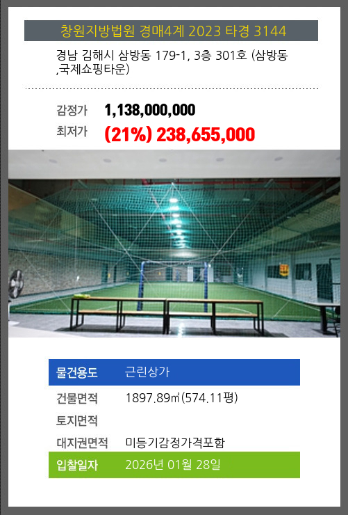 사건번호 2023 타경 3144 본건은 경남 김해시 삼방동 179-1, 3층 301호 (삼방동,국제쇼핑타운)소재하는 근린상가경매 물건의 포스팅입니다. 건물면적 [ 1897.89㎡ (574.11평) ]대지권 [ 미등기감정가격포함 ] 시세를 반영한