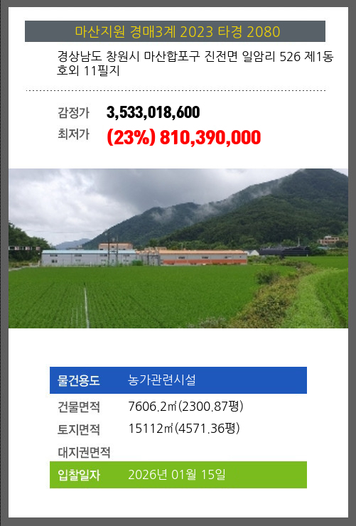 사건번호 2023 타경 2080 본건은 경상남도 창원시 마산합포구 진전면 일암리 526 제1동호외 11필지소재하는 농가관련시설경매 물건의 포스팅입니다. 건물면적 [ 7606.2㎡ (2300.87평) ]토지면적 [ 15112㎡ (4571.36평) ]