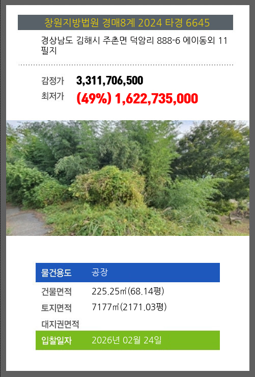 사건번호 2024 타경 6645 본건은 경상남도 김해시 주촌면 덕암리 888-6 에이동외 11필지소재하는 공장경매 물건의 포스팅입니다. 건물면적 [ 225.25㎡ (68.14평) ]토지면적 [ 7177㎡ (2171.03평) ] 시세를