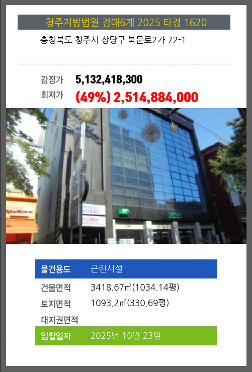 사건번호 2025 타경 1620 본건은 충청북도 청주시 상당구 북문로2가 72-1소재하는 근린시설경매 물건의 포스팅입니다. 건물면적 [ 3418.67㎡ (1034.14평) ]토지면적 [ 1093.2㎡ (330.69평) ] 시세를 반영한 감정가