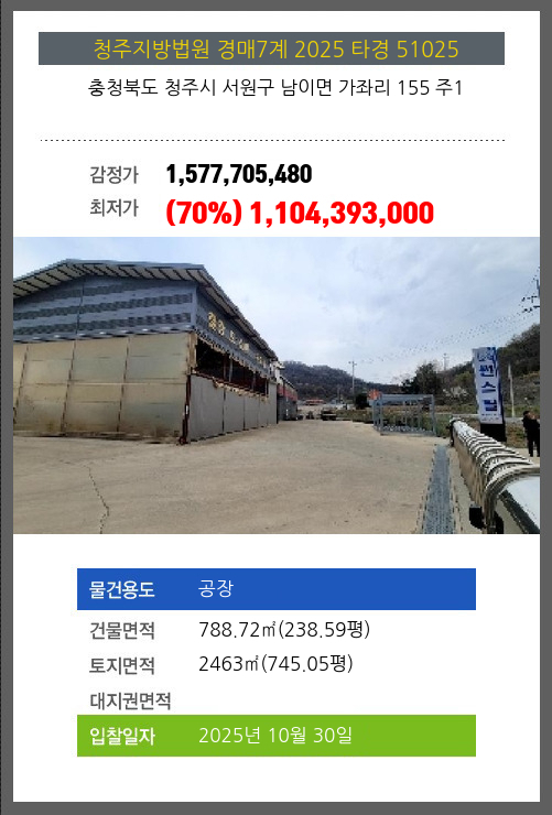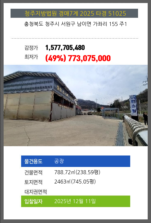 사건번호 2025 타경 51025 본건은 충청북도 청주시 서원구 남이면 가좌리 155 주1소재하는 공장경매 물건의 포스팅입니다. 건물면적 [ 788.72㎡ (238.59평) ]토지면적 [ 2463㎡ (745.05평) ] 시세를