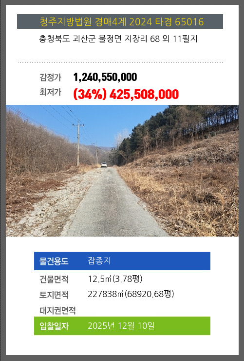 사건번호 2024 타경 65016 본건은 충청북도 괴산군 불정면 지장리 68 외 11필지소재하는 잡종지경매 물건의 포스팅입니다. 건물면적 [ 12.5㎡ (3.78평) ]토지면적 [ 227838㎡ (68920.68평) ] 시세를