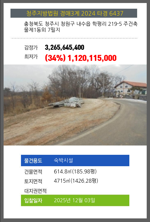 사건번호 2024 타경 6437 본건은 충청북도 청주시 청원구 내수읍 학평리 219-5 주건축물제1동외 7필지소재하는 숙박시설경매 물건의 포스팅입니다. 건물면적 [ 614.8㎡ (185.98평) ]토지면적 [ 4715㎡ (1426.28평) ]