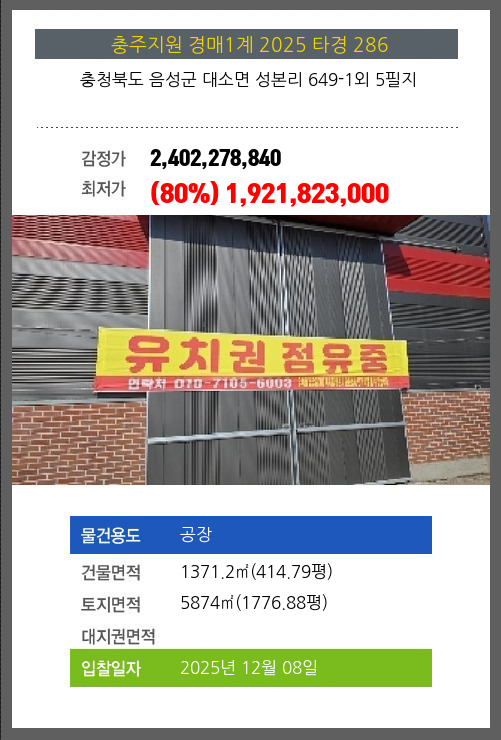 사건번호 2025 타경 286 본건은 충청북도 음성군 대소면 성본리 649-1외 5필지소재하는 공장경매 물건의 포스팅입니다. 건물면적 [ 1371.2㎡ (414.79평) ]토지면적 [ 5874㎡ (1776.88평) ] 시세를 반영한