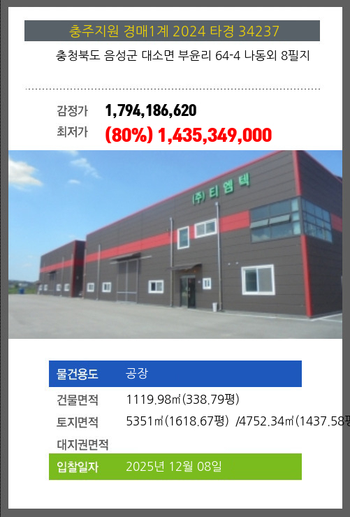 사건번호 2024 타경 34237 본건은 충청북도 음성군 대소면 부윤리 64-4 나동외 8필지소재하는 공장경매 물건의 포스팅입니다. 건물면적 [ 1119.98㎡ (338.79평) ]토지면적 [ 전체:5351㎡ (1618.67평) 매각지분:4752.34㎡ (1437.58평)