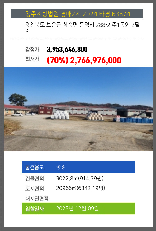 사건번호 2024 타경 63874 본건은 충청북도 보은군 삼승면 둔덕리 288-2 주1동외 2필지소재하는 공장경매 물건의 포스팅입니다. 건물면적 [ 3022.8㎡ (914.39평) ]토지면적 [ 20966㎡ (6342.19평) ] 시세를