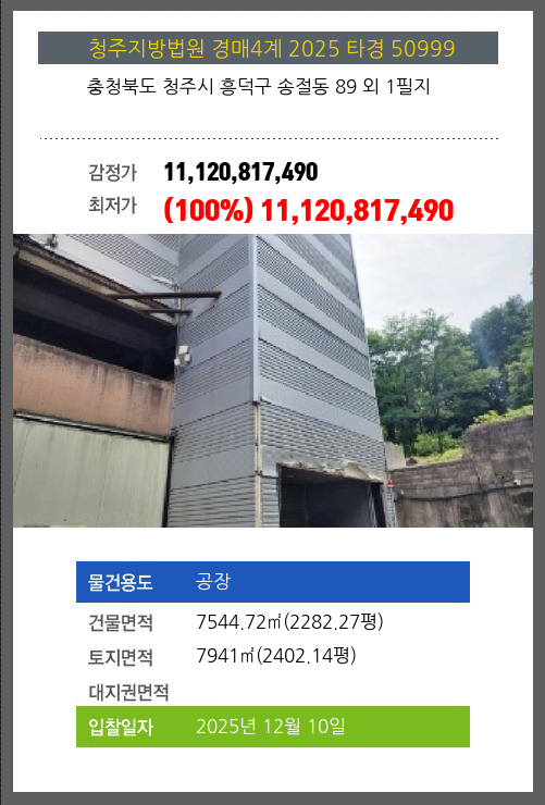 사건번호 2025 타경 50999 본건은 충청북도 청주시 흥덕구 송절동 89 외 1필지소재하는 공장경매 물건의 포스팅입니다. 건물면적 [ 7544.72㎡ (2282.27평) ]토지면적 [ 7941㎡ (2402.14평) ] 시세를
