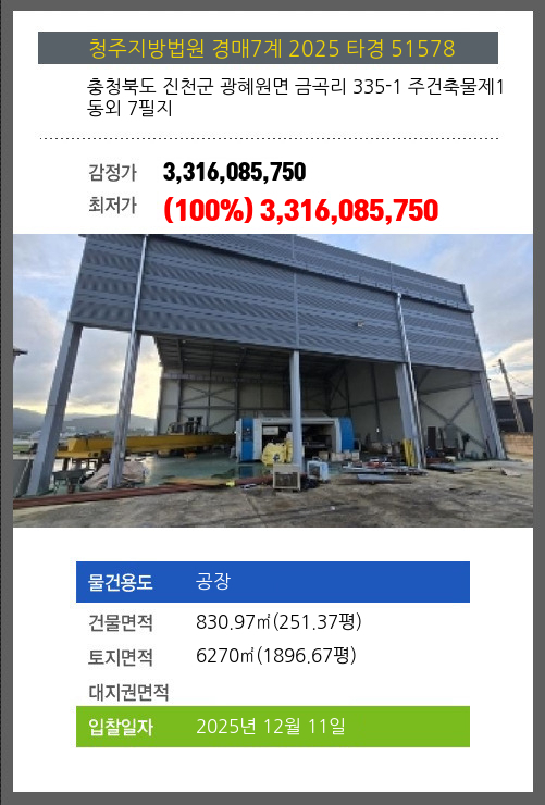 사건번호 2025 타경 51578 본건은 충청북도 진천군 광혜원면 금곡리 335-1 주건축물제1동외 7필지소재하는 공장경매 물건의 포스팅입니다. 건물면적 [ 830.97㎡ (251.37평) ]토지면적 [ 6270㎡ (1896.67평) ] 시세를