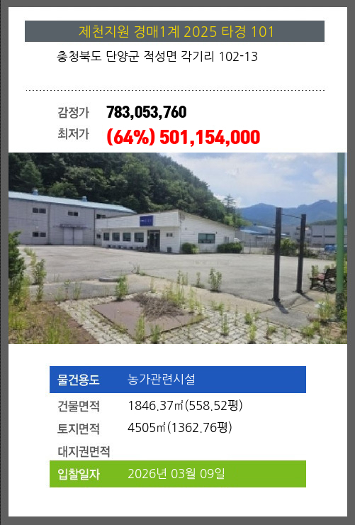 사건번호 2025 타경 101 본건은 충청북도 단양군 적성면 각기리 102-13소재하는 농가관련시설경매 물건의 포스팅입니다. 건물면적 [ 1846.37㎡ (558.52평) ]토지면적 [ 4505㎡ (1362.76평) ] 시세를 반영한 감정가