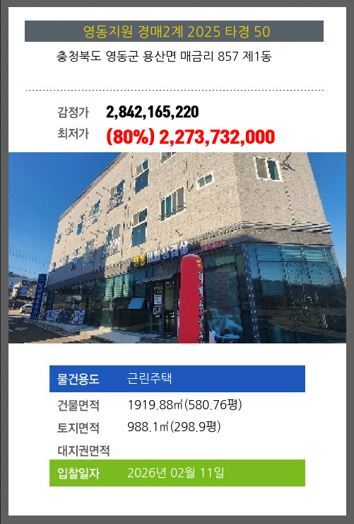 사건번호 2025 타경 50 본건은 충청북도 영동군 용산면 매금리 857 제1동소재하는 근린주택경매 물건의 포스팅입니다. 건물면적 [ 1919.88㎡ (580.76평) ]토지면적 [ 988.1㎡ (298.9평) ] 시세를 반영한