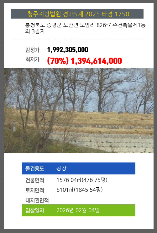 사건번호 2025 타경 1750 본건은 충청북도 증평군 도안면 노암리 826-7 주건축물제1동외 3필지소재하는 공장경매 물건의 포스팅입니다. 건물면적 [ 1576.04㎡ (476.75평) ]토지면적 [ 6101㎡ (1845.54평) ] 시세를