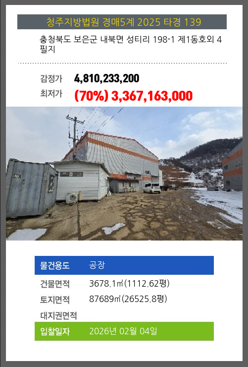 사건번호 2025 타경 139 본건은 충청북도 보은군 내북면 성티리 198-1 제1동호외 4필지소재하는 공장경매 물건의 포스팅입니다. 건물면적 [ 3678.1㎡ (1112.62평) ]토지면적 [ 87689㎡ (26525.8평) ] 시세를