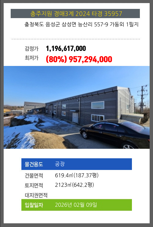 사건번호 2024 타경 35957 본건은 충청북도 음성군 삼성면 능산리 557-9 가동외 1필지소재하는 공장경매 물건의 포스팅입니다. 건물면적 [ 619.4㎡ (187.37평) ]토지면적 [ 2123㎡ (642.2평) ] 시세를