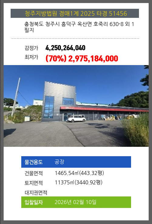 사건번호 2025 타경 51456 본건은 충청북도 청주시 흥덕구 옥산면 호죽리 630-8 외 1필지소재하는 공장경매 물건의 포스팅입니다. 건물면적 [ 1465.54㎡ (443.32평) ]토지면적 [ 11375㎡ (3440.92평) ]