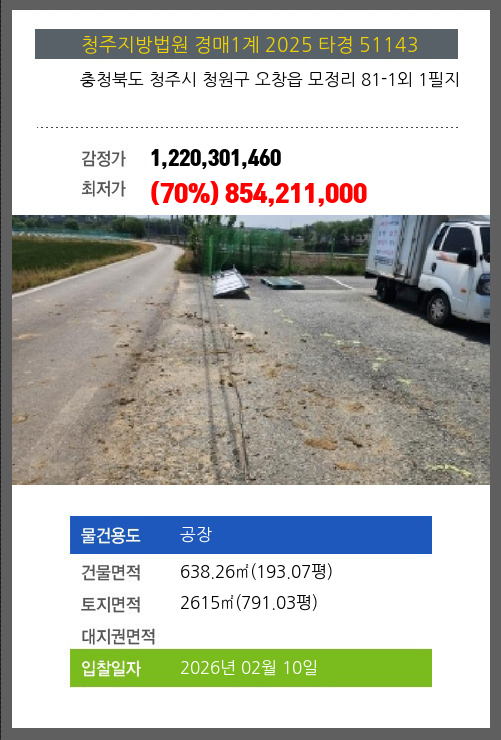 사건번호 2025 타경 51143 본건은 충청북도 청주시 청원구 오창읍 모정리 81-1외 1필지소재하는 공장경매 물건의 포스팅입니다. 건물면적 [ 638.26㎡ (193.07평) ]토지면적 [ 2615㎡ (791.03평) ] 시세를