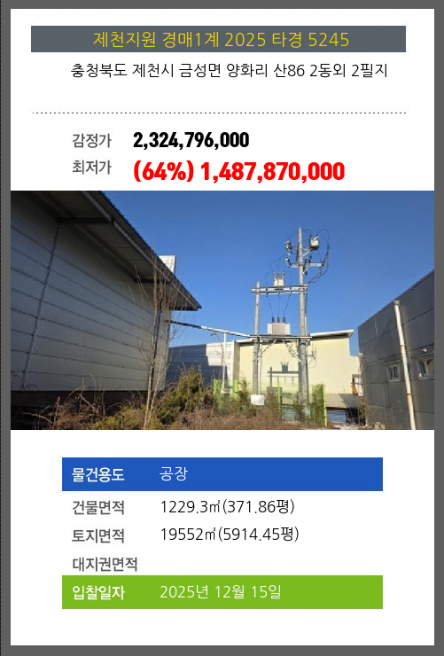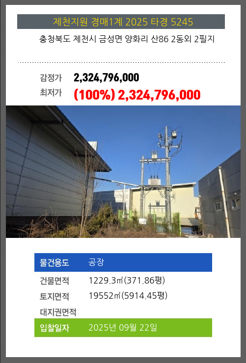 사건번호 2025 타경 5245 본건은 충청북도 제천시 금성면 양화리 산86 2동외 2필지소재하는 공장경매 물건의 포스팅입니다. 건물면적 [ 1229.3㎡ (371.86평) ]토지면적 [ 19552㎡ (5914.45평) ] 시세를